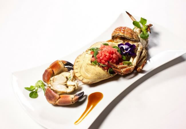 Nous cuisons le crabe, le débarrassons de sa chair et réservons la tête pour l’utiliser comme récipient. Veillez à conserver les liquides libérés par le bœuf lors de son nettoyage, car nous les utiliserons pour préparer la vinaigrette. Coupez la pastèque en petits cubes, mélangez-les avec la mâche et le bœuf, farcissez-les et assaisonnez-les avec la vinaigrette. Servir avec les pattes restantes.